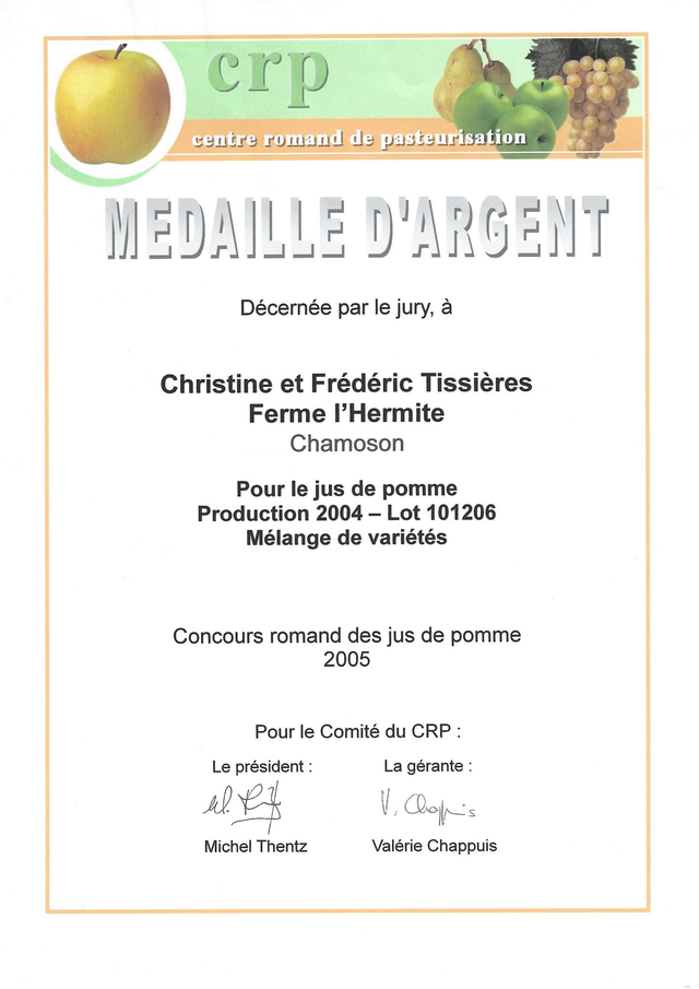 Produit médaillé d'argent au Concours romand des jus de pomme.