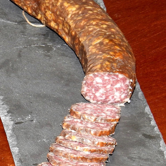 Ingrédients: Viande de boeuf suisse 75 % - lard de dos Suisse 22 % - Sel pour saumure ( sel de cuisine) épices 3 % - dextrose